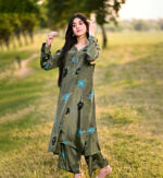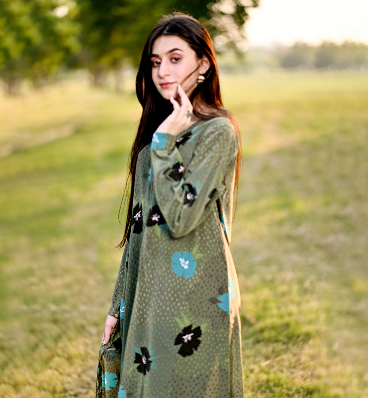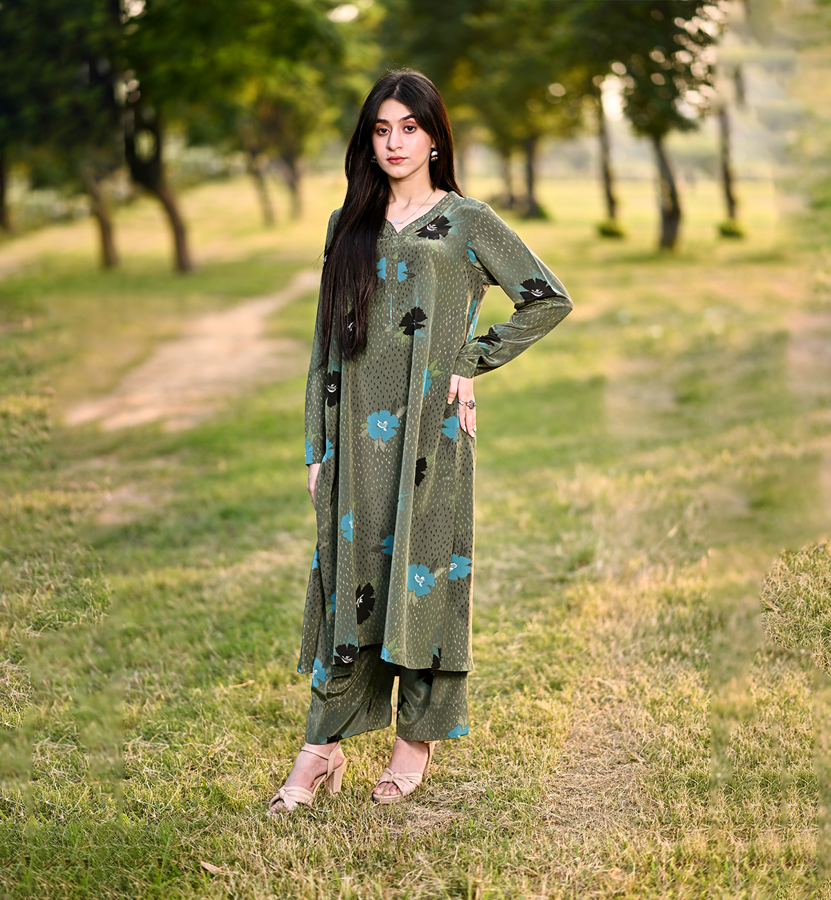 This two-piece dark green Charmeuse silk dress, featuring a sleek and lightweight design, is adorned with a beautiful all-over printed floral pattern. The combination of the rich green hue and vibrant floral prints creates a stunning look that is both elegant and refreshing. Perfect for various occasions, this dress effortlessly blends style and comfort, making it a must-have addition to your wardrobe.