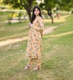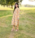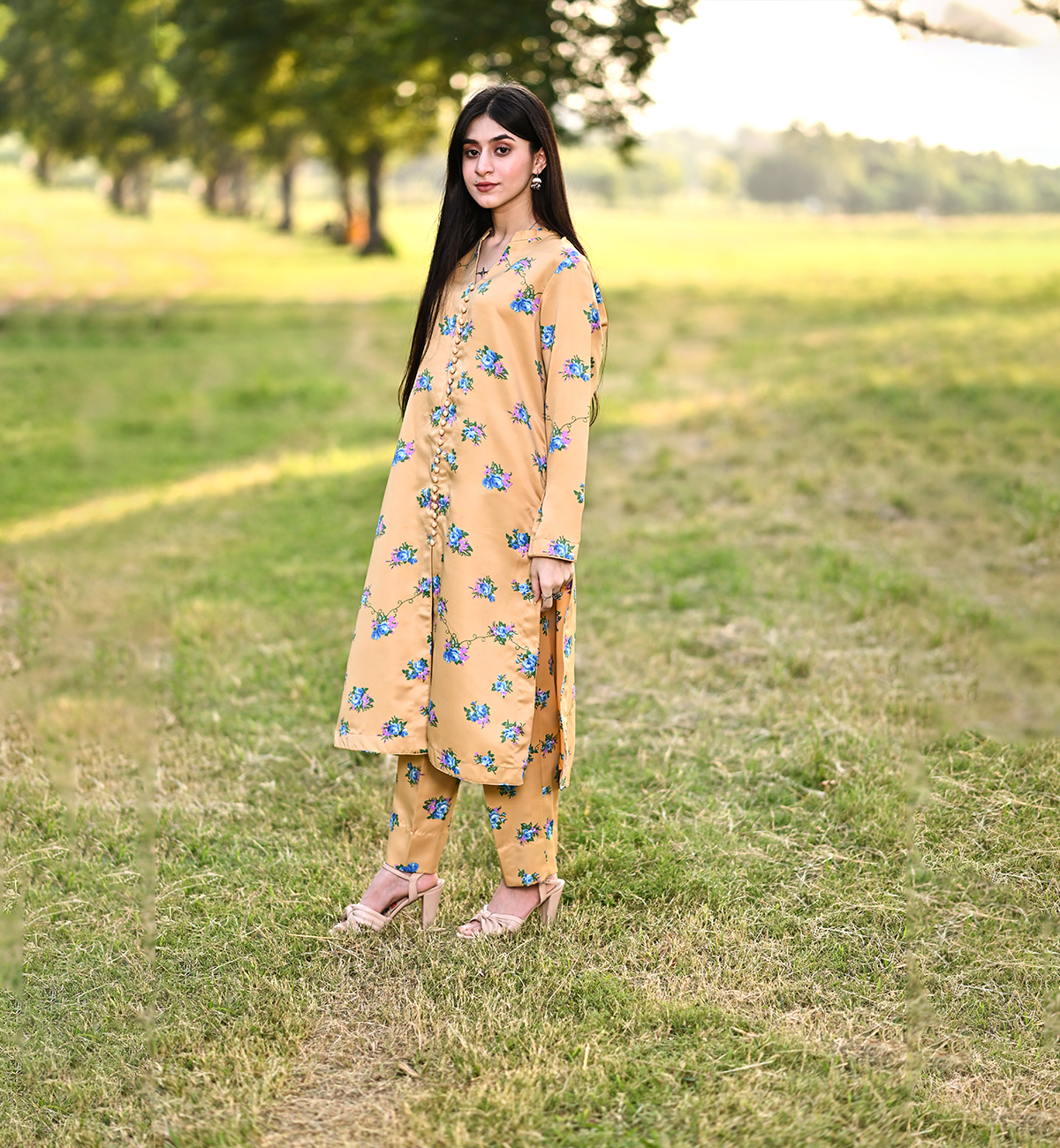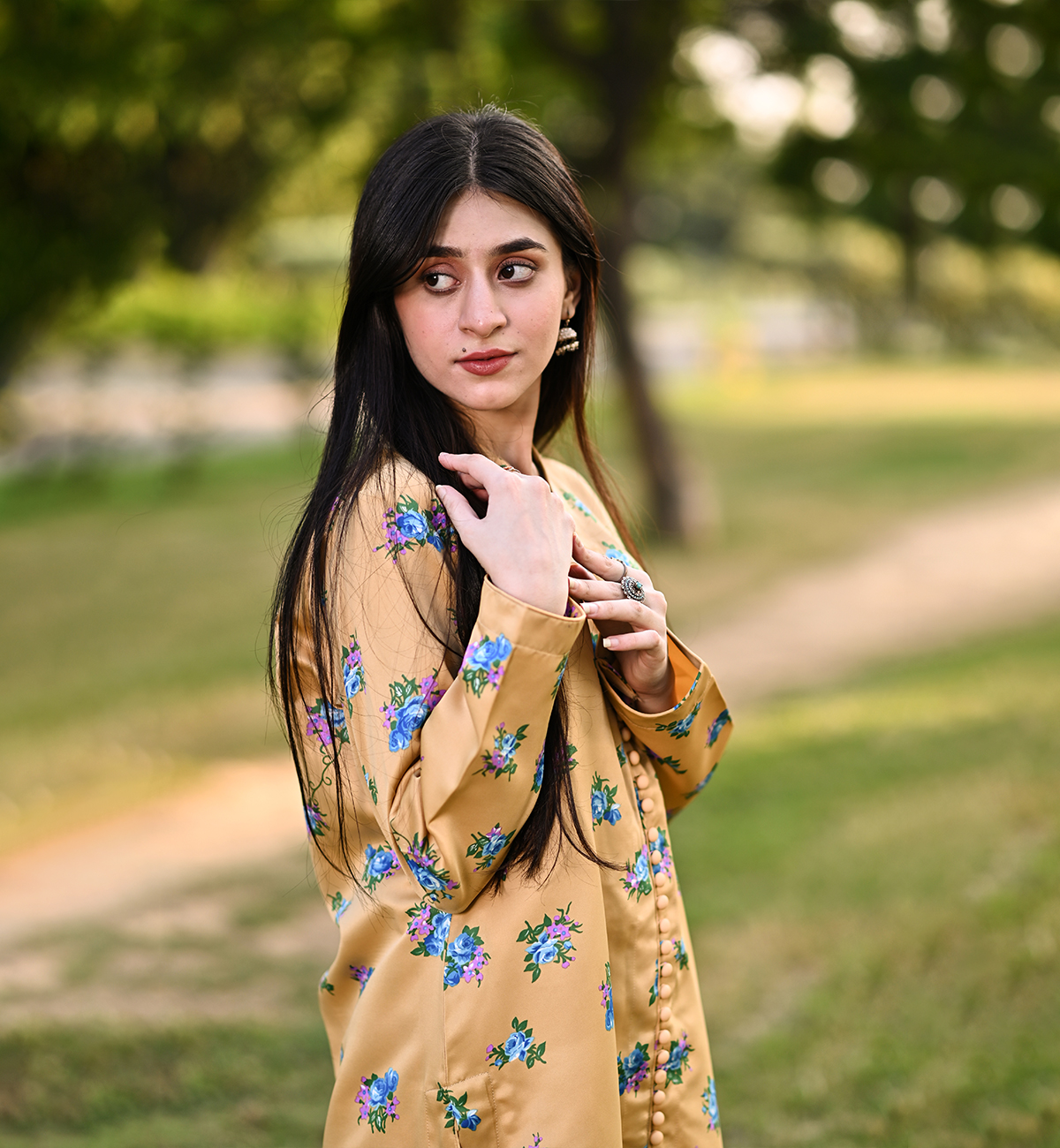 This two-piece dress in a light camel color features a delicate floral pattern, epitomizing elegance while offering the perfect balance of comfort and shape. Crafted from soft cotton satin, the ensemble combines a flattering silhouette with luxurious fabric, making it an ideal choice for both casual outings and special occasions. Experience effortless style and grace in this beautifully designed piece.