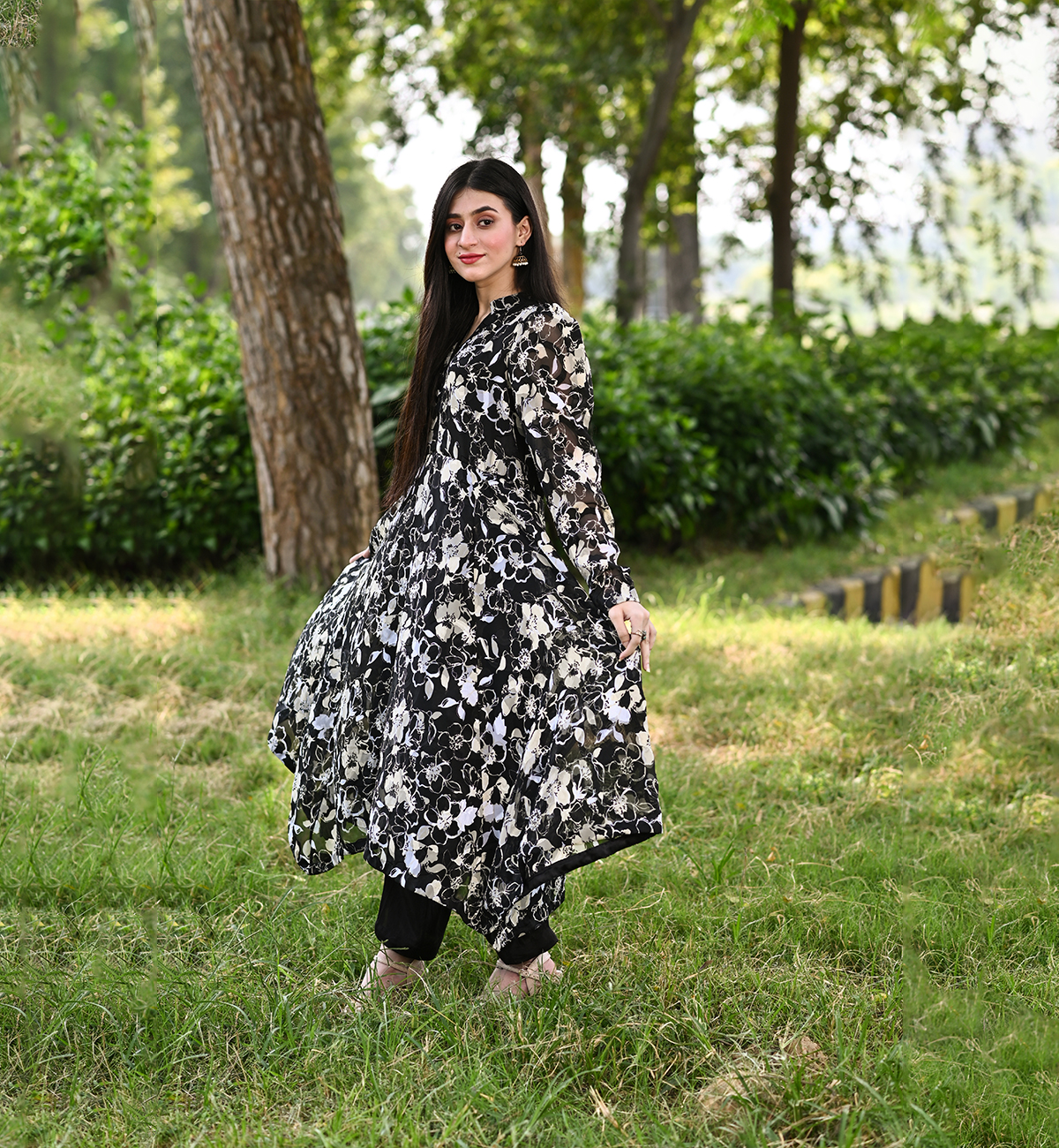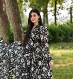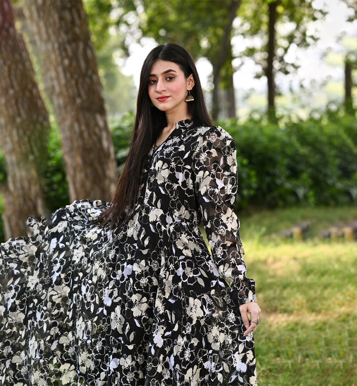 Crafted from delicate brosha chiffon fabric, this loose-fit, printed dress exudes effortless elegance. It features a V-neckline and puffy sleeves, while a gathered seam at the waist adds structure and shape. The gently flared skirt, with its asymmetric hem, creates a flowing silhouette that combines comfort with a touch of modern sophistication.
