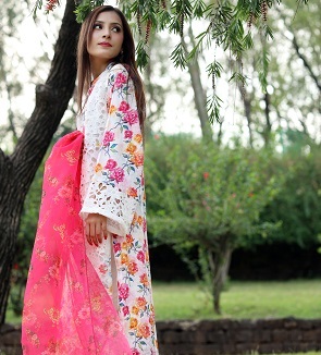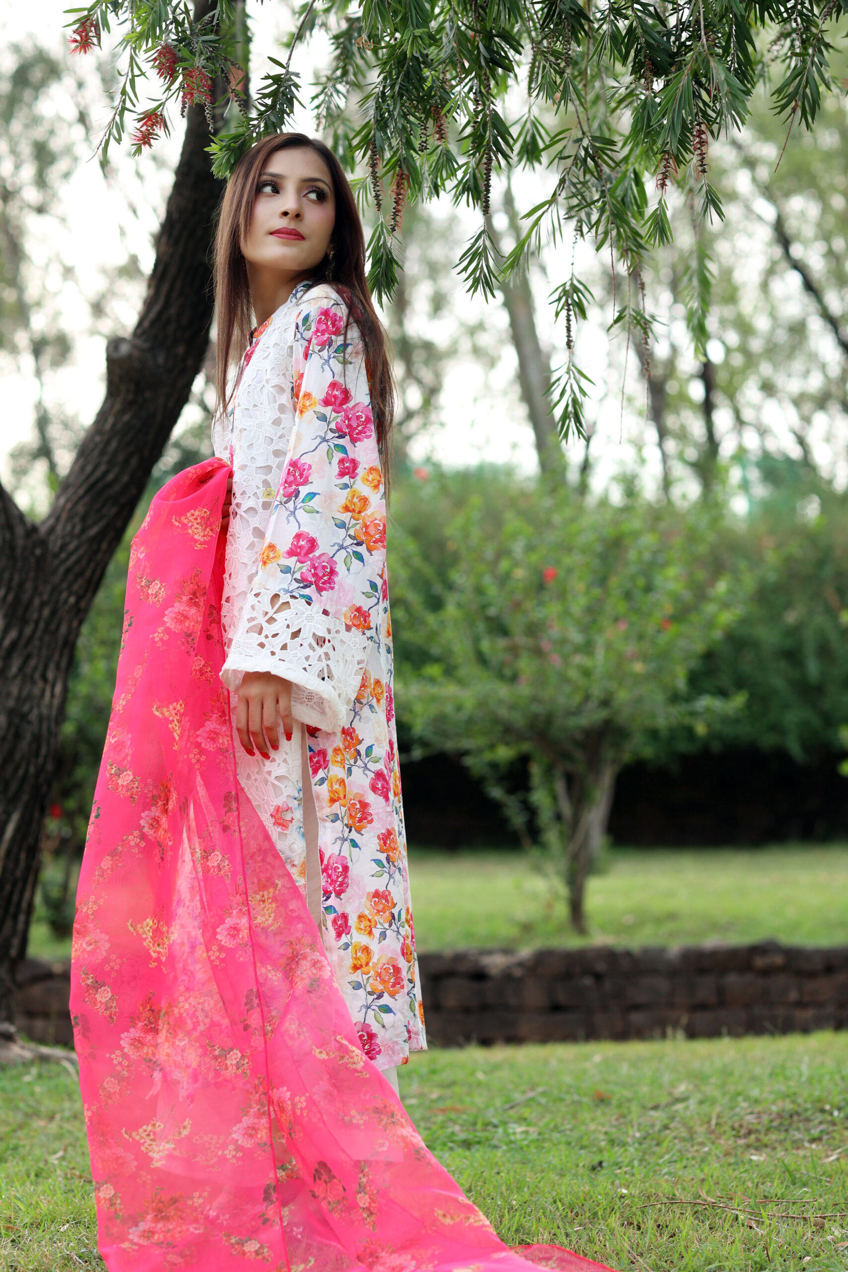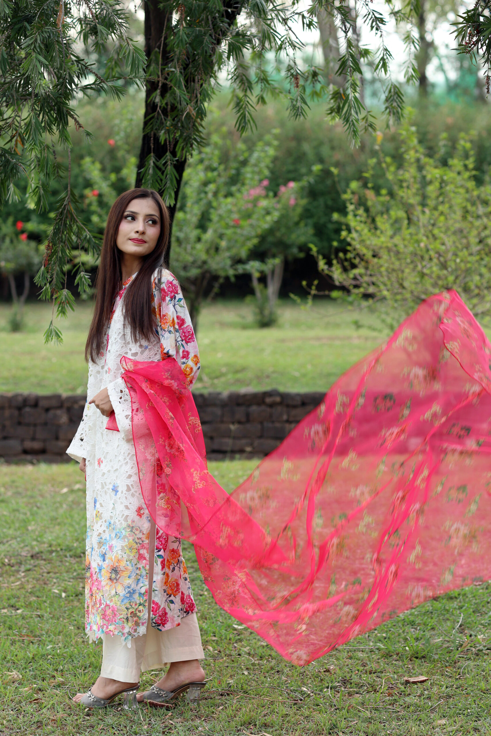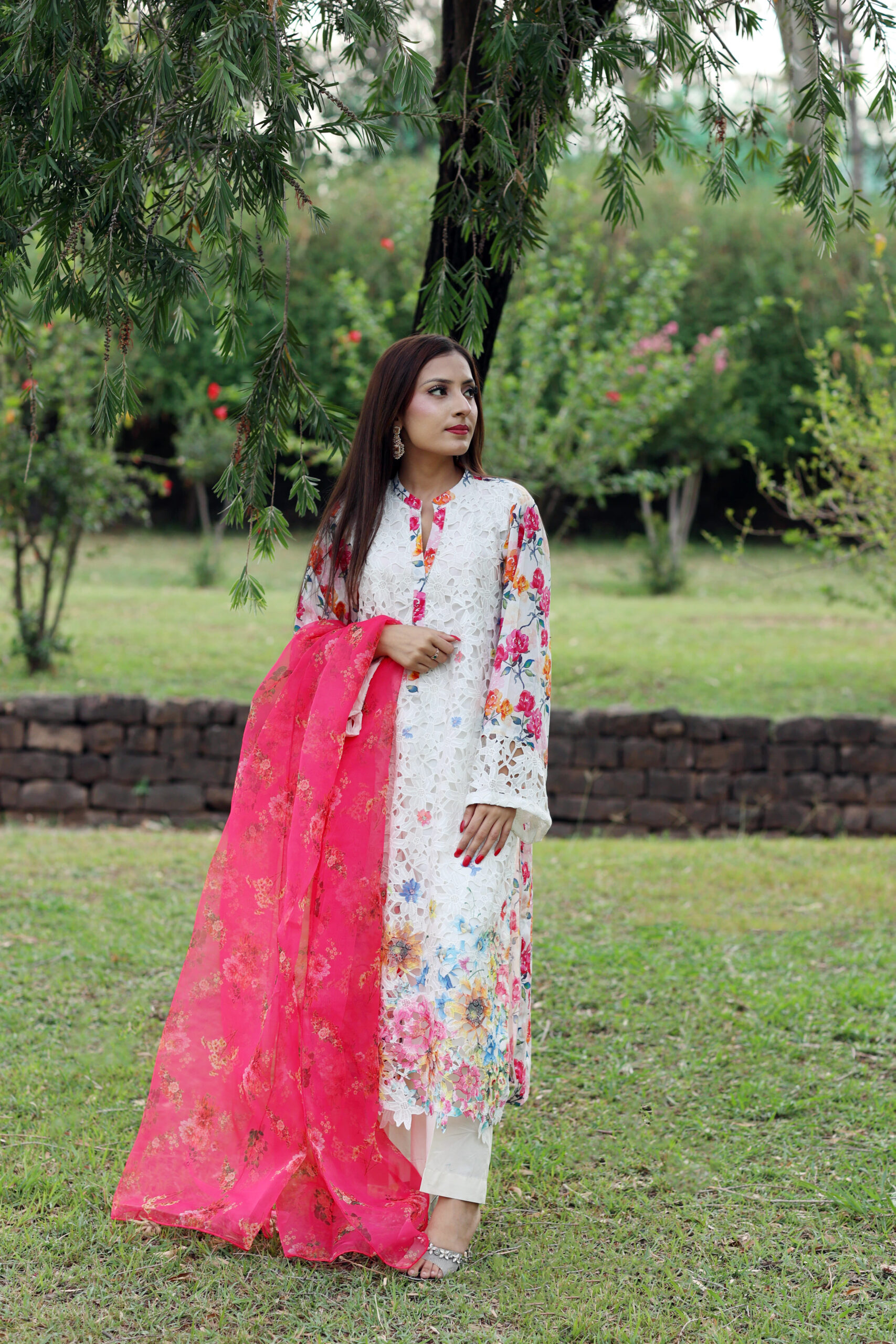 A beautifully elegant three-piece ensemble featuring a white shirt front adorned with intricate floral cutwork appliqué and delicate lace detailing, perfectly blending texture and grace. The shirt’s back showcases a soft, colorful floral print, adding a charming contrast to the front’s artisanal detailing. It is paired with straight white trousers that maintain a clean and sophisticated silhouette. Completing the look is a vibrant pink organza dupatta, embellished with golden floral patterns, offering a touch of festive elegance and refinement.