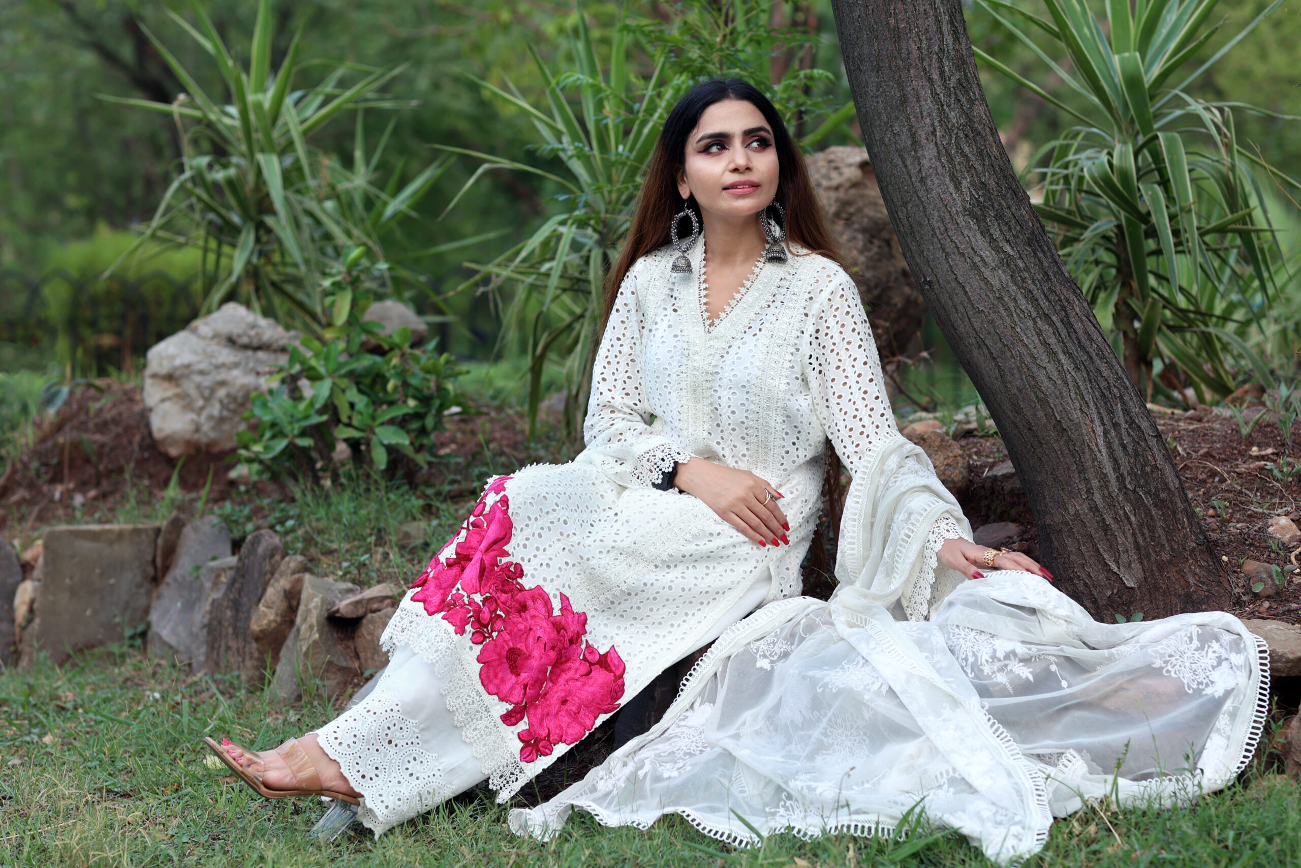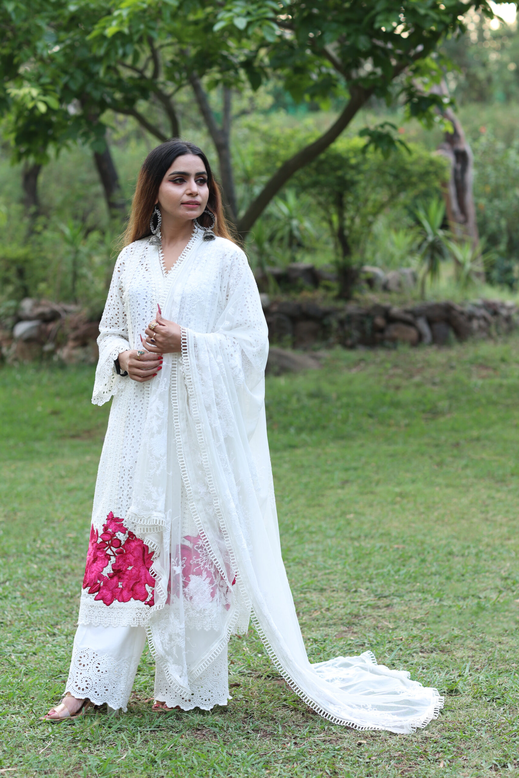A timeless white chikankari shirt beautifully enhanced with delicate pink appliqué flowers along the front hem, adding a soft touch of color and charm. Paired with classic white trouser for a clean and graceful look. The ensemble is completed with a white embroidered net dupatta, exuding airy elegance and refinement—perfect for daytime sophistication or festive gatherings.