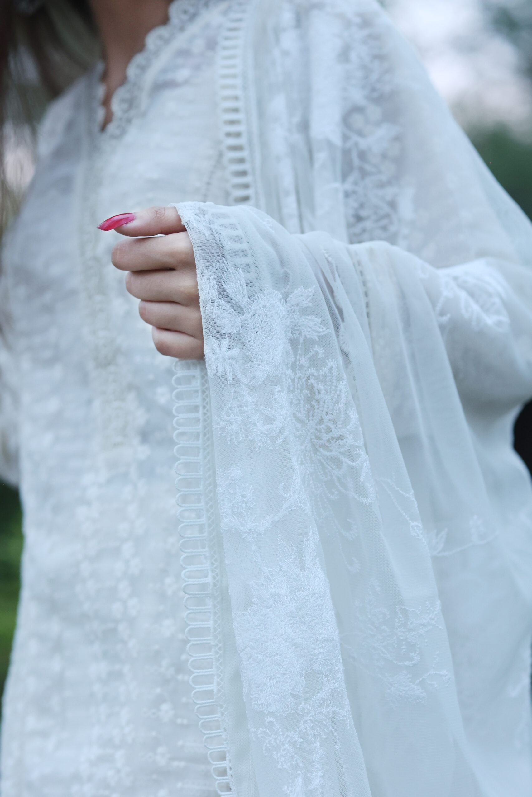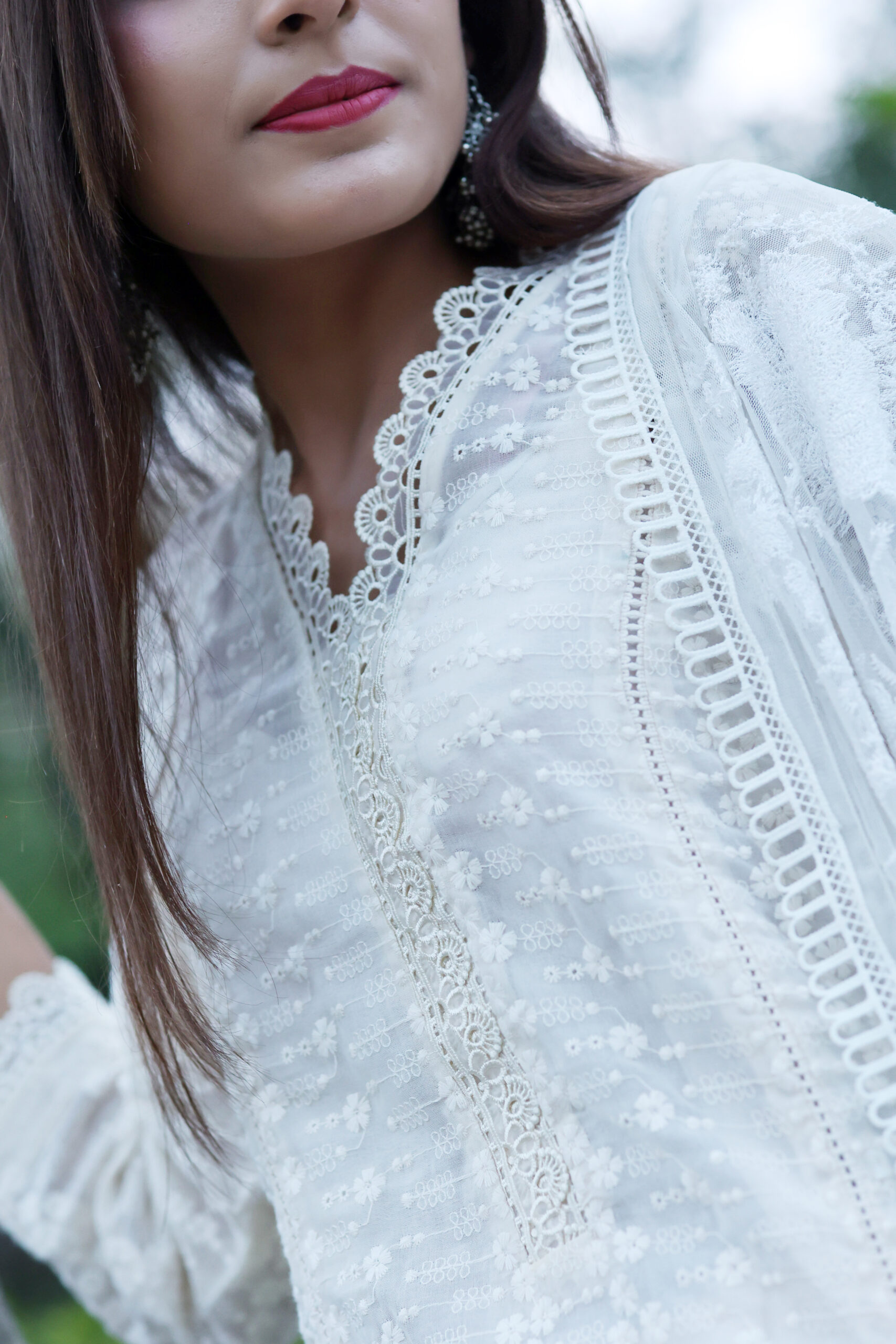 This two-piece off-white cotton dress, rendered with delicate embroidery, exudes subtle elegance. The ethereal embroidered flowing shirt features intricate detailing complemented by beautiful matching lace, creating a graceful silhouette. Paired with a stylishly west line printed cotton trouser, this ensemble achieves a perfect balance of sophistication and comfort, making it an ideal choice for any occasion.